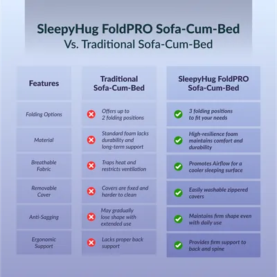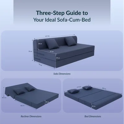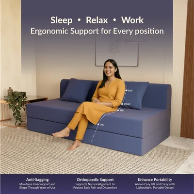 3-in-1 Convertible Functionality: Seamlessly transforms from a 3-seater sofa to a lounger to a full-size bed. Perfect for compact spaces, this versatile unit adapts to your lifestyle — from working to relaxing to sleeping — in seconds. High-Resilience Foam Core: Crafted with durable, shape-retaining HR foam for consistent support and bounce. Say goodbye to sagging and enjoy long-lasting comfort — whether seated or lying flat. TouchSense Technology + Breathable Fabric: The responsive surface adapts to your body while the high-GSM tricot fabric allows airflow, keeping your lounging or sleeping experience cool and fresh. Compact & Lightweight Design: Measuring 72x60x7 inches in sofa mode and weighing under 20 kg, it’s easy to move around, reposition, or store — perfect for modern, space-conscious homes. Removable & Washable Cover: Comes with a zippered, machine-washable cover for easy maintenance. Keep your sofa-cum-bed looking fresh and hygienic with minimal effort.