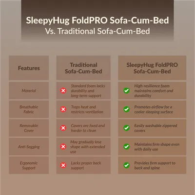 3-in-1 Convertible Functionality: Seamlessly transforms from a 3-seater sofa to a lounger to a full-size bed. Perfect for compact spaces, this versatile unit adapts to your lifestyle — from working to relaxing to sleeping — in seconds. High-Resilience Foam Core: Crafted with durable, shape-retaining HR foam for consistent support and bounce. Say goodbye to sagging and enjoy long-lasting comfort — whether seated or lying flat. TouchSense Technology + Breathable Fabric: The responsive surface adapts to your body while the high-GSM tricot fabric allows airflow, keeping your lounging or sleeping experience cool and fresh. Compact & Lightweight Design: Measuring 72x60x7 inches in sofa mode and weighing under 20 kg, it’s easy to move around, reposition, or store — perfect for modern, space-conscious homes. Removable & Washable Cover: Comes with a zippered, machine-washable cover for easy maintenance. Keep your sofa-cum-bed looking fresh and hygienic with minimal effort.