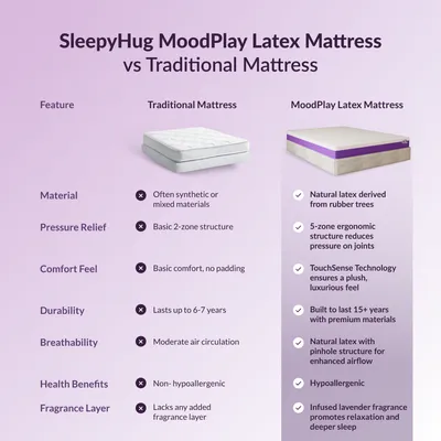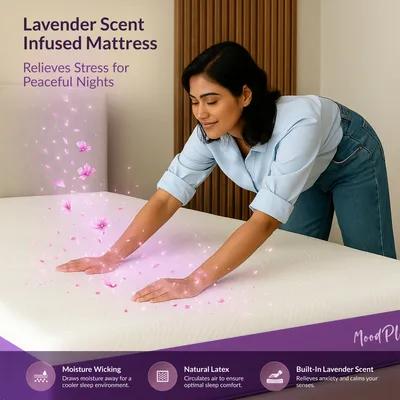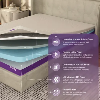 TouchSense Technology: The mattress dynamically responds to your body’s movement, delivering adaptive support and bounce for personalized comfort every night. Natural Latex & Breathable Comfort: Constructed with layers of Natural Latex, HR Soft Foam, and HR Base Foam—wrapped in a premium breathable fabric for long-lasting softness and resilience. 5-Zone Ergonomic Alignment: Provides targeted pressure relief across key zones—head, shoulders, back, hips, and legs—for balanced posture and orthopaedic support. Soothing Lavender Aroma: Infused with a calming lavender scent, the mattress Promotes a peaceful sleep environment and subtle sensory relaxation. Hypoallergenic & Skin-Friendly: Made from eco-conscious natural latex, this mattress naturally resists dust mites and allergens—ideal for sensitive skin and health-conscious sleepers. 10-Year Warranty for Long-Term Assurance: Built to last with durable materials and reinforced support layers, backed by a decade-long manufacturer warranty.