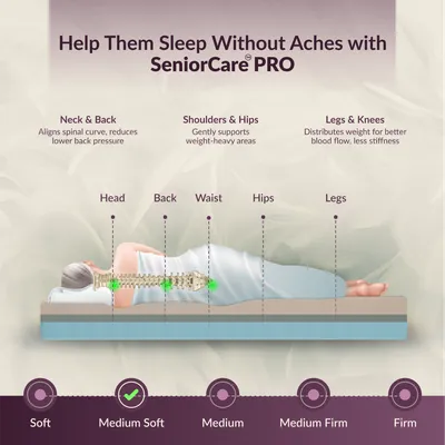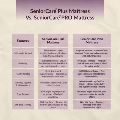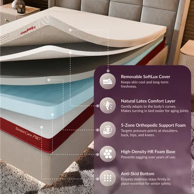Adaptive Latex for Aging Joints: Crafted with TouchSense Technology, the natural latex layer gently adapts to body contours and movement, delivering responsive comfort and relieving stress on sensitive joints—perfect for senior bodies. Zoned Orthopaedic Relief System: Built with 5-zone pressure mapping, the mattress targets pain-Prone areas like shoulders, spine, hips, and knees—enhancing mobility and Promoting better posture during rest. Medium-Soft Bounce for Joint Ease: Designed for delicate joints and backs, the natural latex offers gentle bounce without putting pressure—ideal for arthritis or age-related pain. Safe Mobility with Edge Reinforcement: Reinforced edges Provide added stability when getting in and out of bed—imProving mobility and reducing fall risk for elderly users. Breathable & Hypoallergenic Comfort: Latex's natural airflow, anti-microbial Properties, and eco-friendly structure offer a clean, allergen-free sleep surface for seniors. Built to Last with 15-Year Warranty: High-resilience foam and anti-sagging design ensure years of consistent support - backed by a decade-long warranty and 100-night trial.